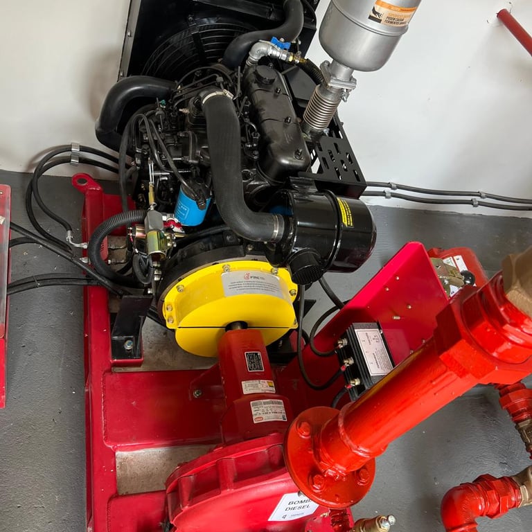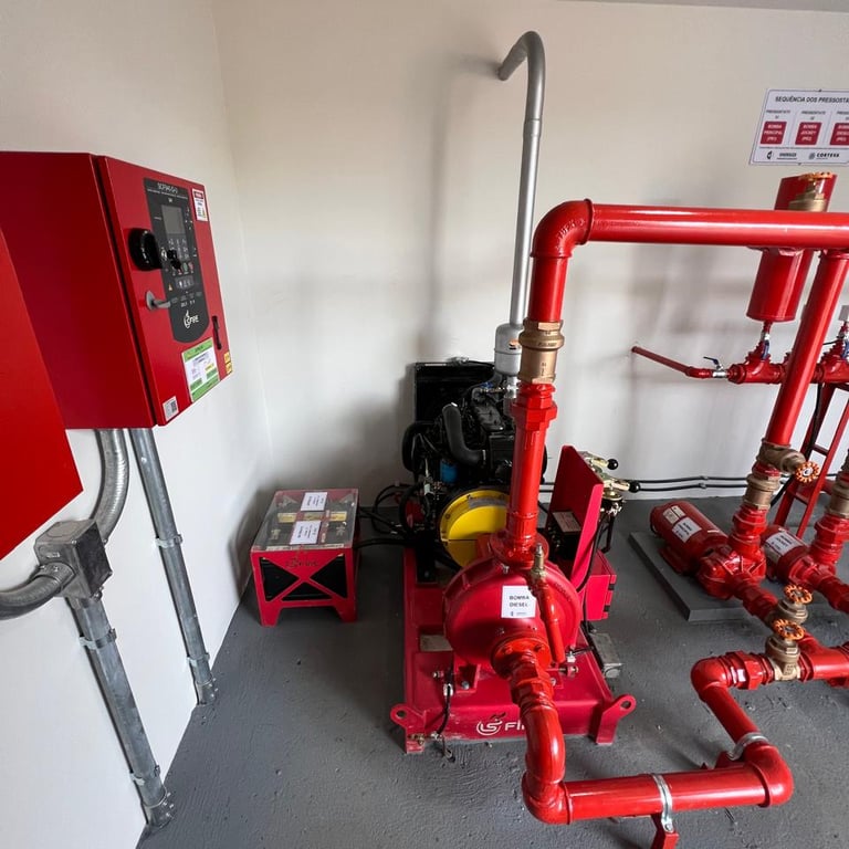 Redundância Hidráulica: Instalação de Motobomba a diesel para operação independente da rede elétrica e Bomba Jockey automatizada para manutenção constante da pressurização da linha, evitando golpes de aríete.