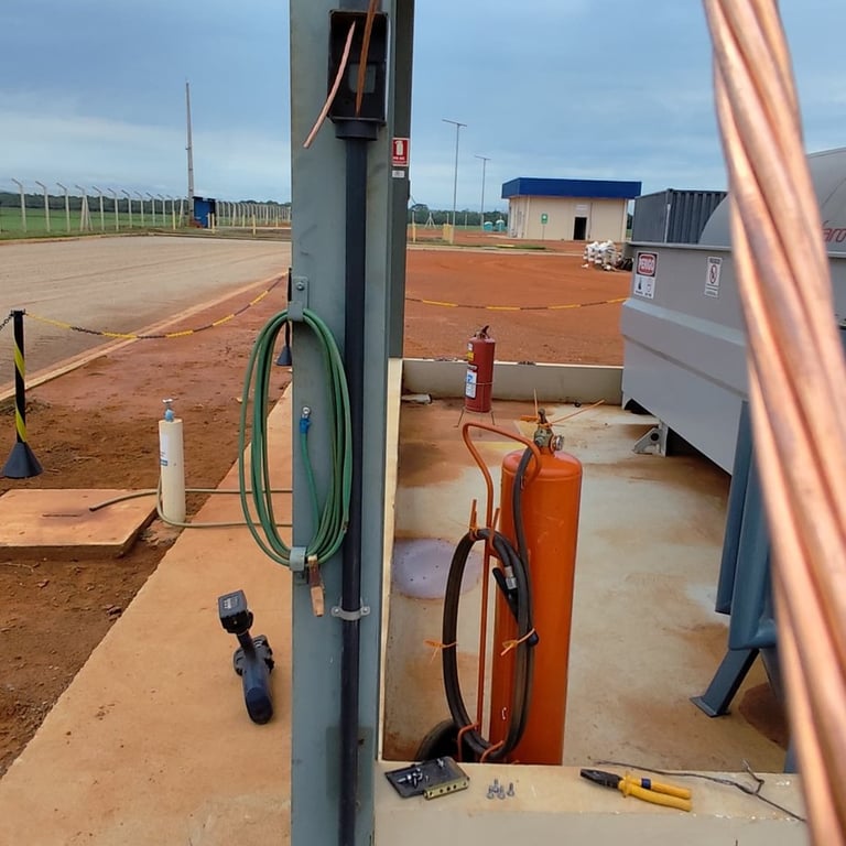 O escopo do projeto envolveu a correção severa da infraestrutura existente. Identificamos o uso de cabos fora dos padrões normativos e realizamos a substituição total por condutores certificados e dimensionados corretamente. Além disso, executamos a equipotencialização de equipamentos e estruturas industriais, um passo fundamental para evitar centelhamentos laterais e garantir a segurança operacional.