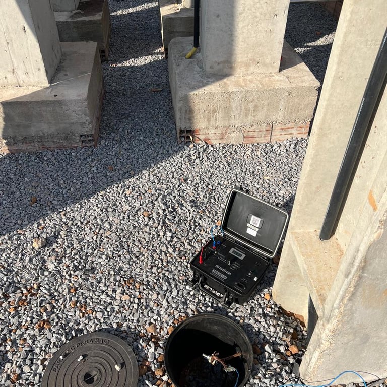 Extratificação do Solo: Para dimensionamento da malha de aterrametno foi realizado um estudo de extratificação do solo pelo Método de Wenner, utilizando nosso terrômetro da Instrum TMD 20K.